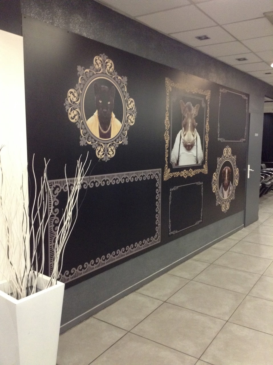 Pour l’ouverture d’un salon de coiffure à Metz DEVISU a réalisé divers décors sur pvc noir teinté dans la masse. Notre machine d’impression étant équipée de blanc cela nous a permis d’imprimer