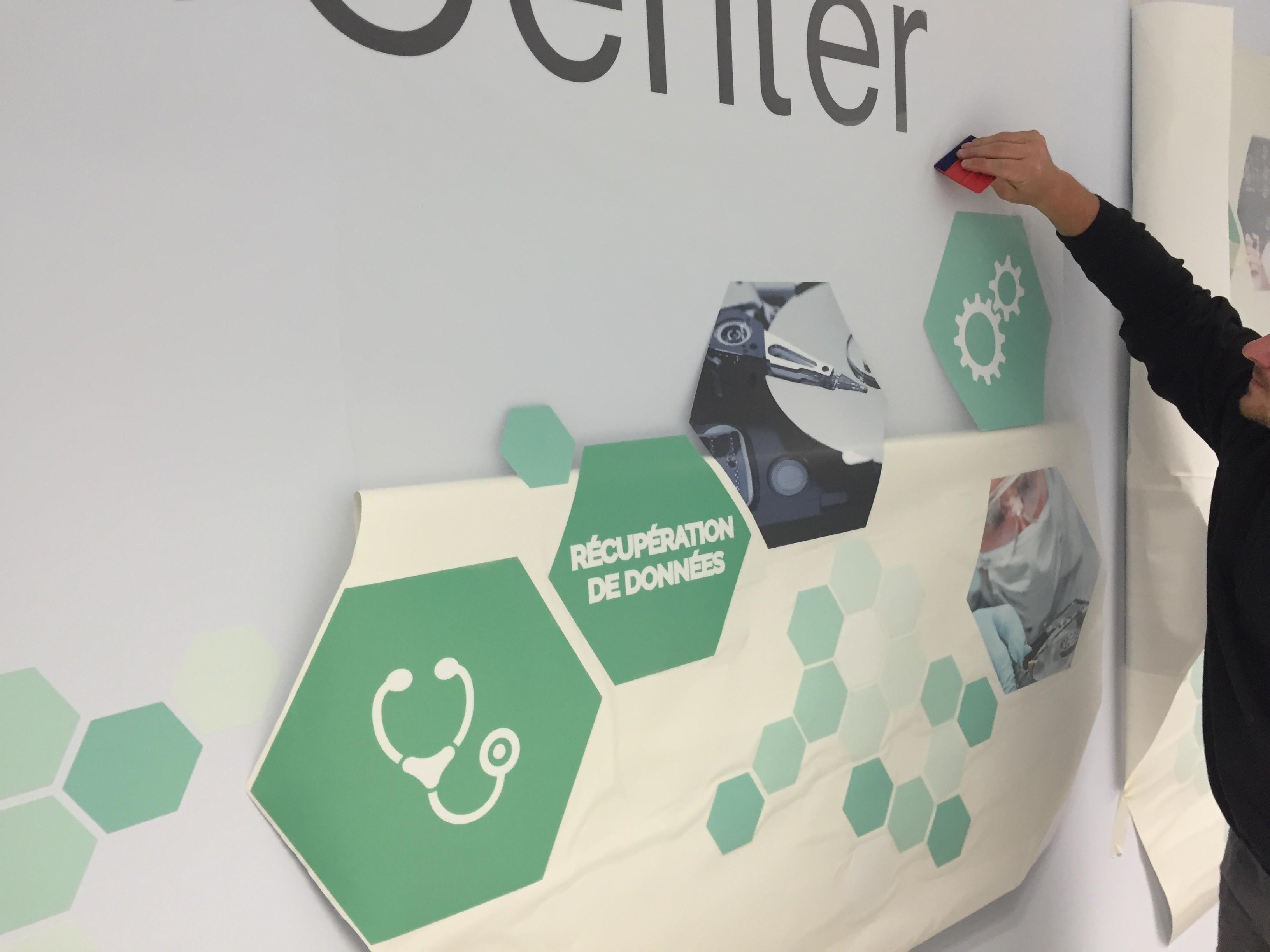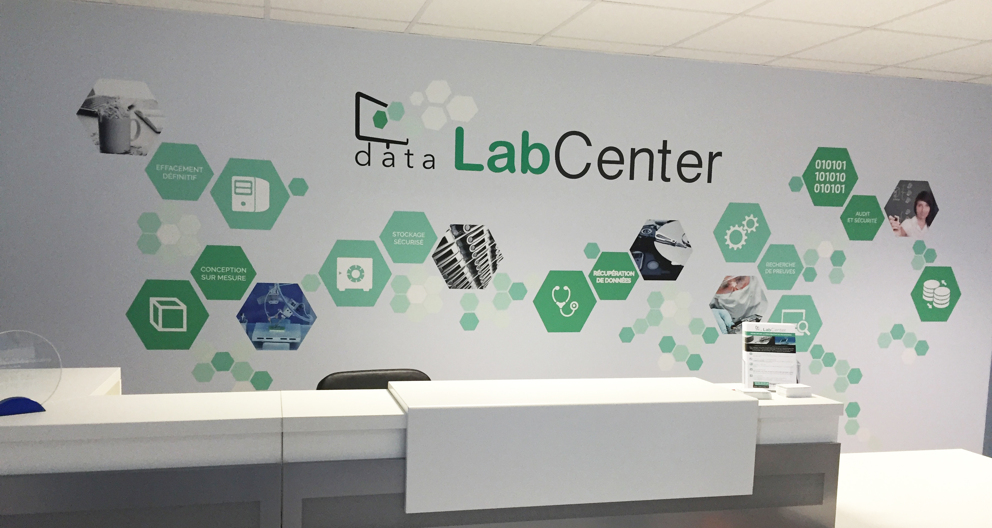 Data LabCenter entreprise spécialisée dans la récupération de données nous a confié l’habillage de son entrée. L’ensemble a été réalisé sur un #vinyl spécial mur et imprimé avec nos encres #HPLATEX