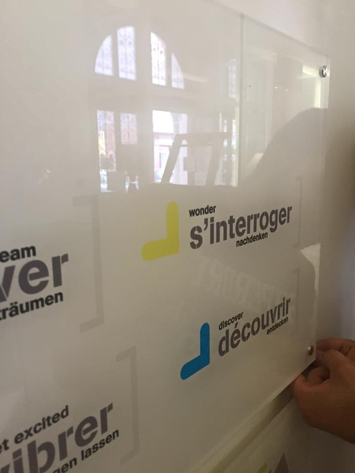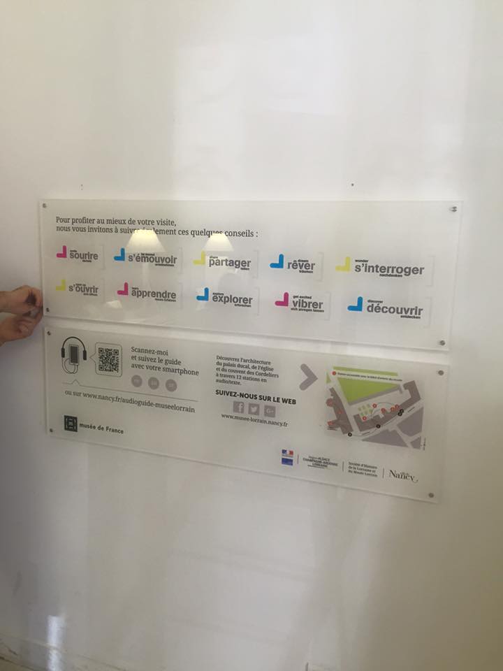 Nouvelle signalétique pour l’entrée du Musée Lorrain impression sur plexi transparent 10mm d’épaisseur impression directe sur le support + blanc de soutien machine. Les 4 panneaux ont